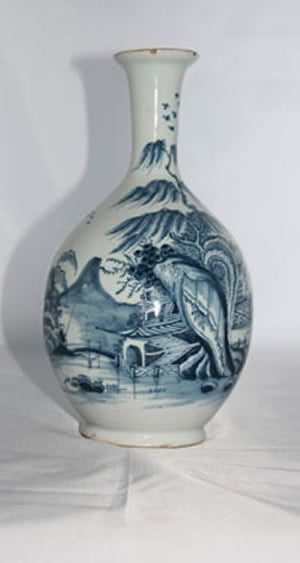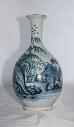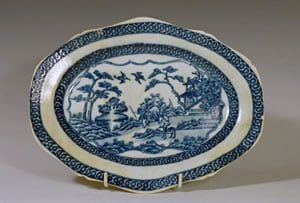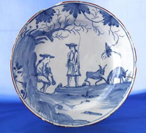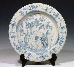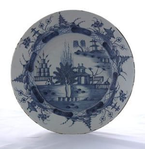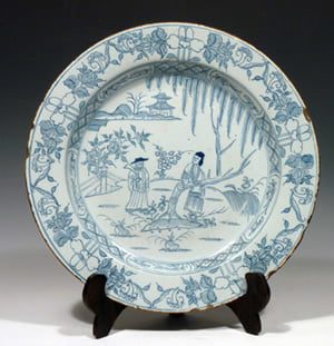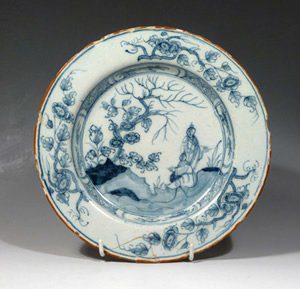 This Liverpool tinglazed plate is painted in blue on a pale blue glaze with two Chinamen in an oriental landscape. This design is later found on Bow porcelain. There is presumably a Chinese source.