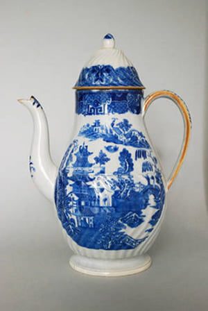 A pearlware coffee pot with moulded spiral fluting to waist level of the pot, and also on the lid. It is decorated with a transfer print of the Herculaneum version of the ‘Two Temples’ pattern.