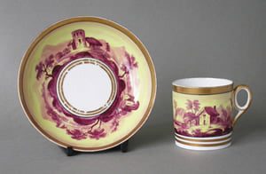 A porcelain coffee can & saucer decorated in Herculaneum Pattern No. 230, a continuous landscape in puce on a yellow wash, a rare polychrome variant of the much more common Pattern 273. The ‘oval’ handle shape is particularly rare on Herculaneum cups and cans.