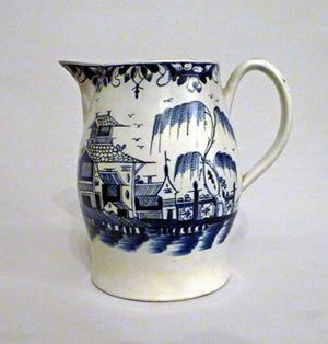 A pearlware jug probably made in Liverpool. The jug is painted in underglaze blue with a group of oriental buildings to one side. There is an intricate leaf border & scrolling to the handle.