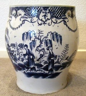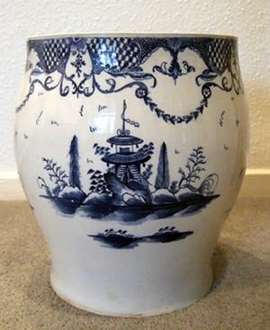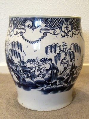 A large jardinière probably made in Liverpool and painted in underglaze blue with an elaborate border involving trellis and cod roe panels and with festoons suspended below.