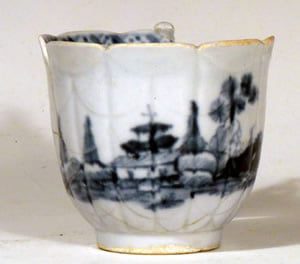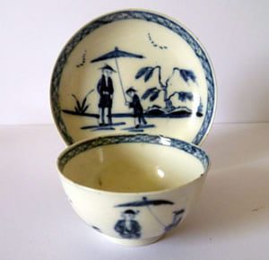 A Liverpool – possibly Seth Pennington – blue & white teabowl and saucer painted underglaze with a scarce pattern of a man with an umbrella and another figure. The blue is inky. Paste soft and translucency greyish straw. Date