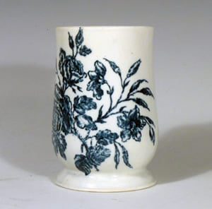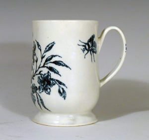 A Liverpool porcelain mug printed in underglaze blue with the “Rose Spray” pattern and subsidiary prints of a bumble bee, dragon fly and moth. This bell shaped mug on a spreading base was made by Seth Pennington.