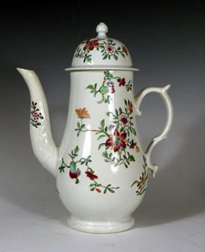 A Liverpool porcelain coffee pot with leaf moulded spout and handle of comma terminal type. Painted with floral sprays in a palette with a prominent dark red.
