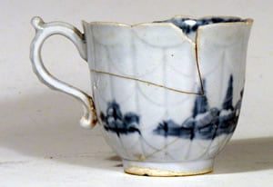 A cup reconstructed from shards excavated on the Brownlow Hill site of the William Reid Manufactory. It displays a moulding not yet found on an extant example. Maybe its illustration here will bring one to light!
