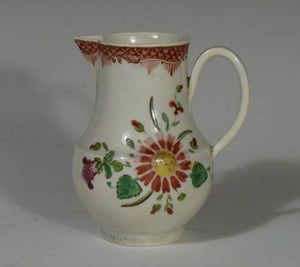 A Liverpool porcelain milk jug painted with a prominent red & yellow daisy-like flower and a dark red scale border of Chinese export type.
