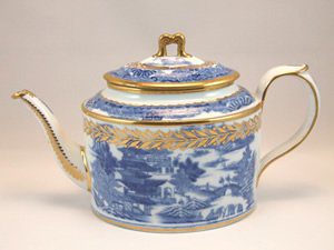 A Wolfe, Mason and Lucock, Liverpool, hybrid hard paste plain oval shape teapot, decorated in the underglaze blue print “Shuttered Windows” and gilding. No mark