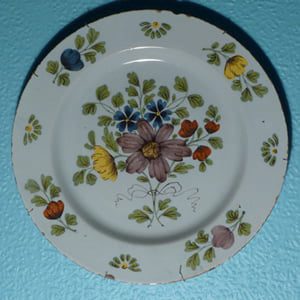 A delft charger painted with a bunch of flowers, tied with a twine bow, in the so-called Fazackerly palette and with further flowers to the rim. The dish has a pale blue glaze and is probably a Liverpool piece. Flowers tied with twine are sometimes assigned exclusively to Bristol, presumably because some pieces with such designs have bianco sopra bianco borders but there seems to be no logical reason for this.