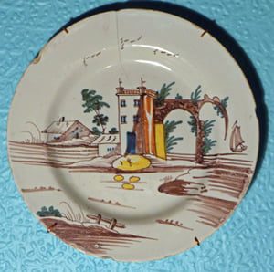 A delft plate with a pale blue glaze and painted in polychrome with an arrangement of buildings & ruined arches in typical Liverpool style. The tall building & the ruined arch with sailing boat are also found on Liverpool porcelain.