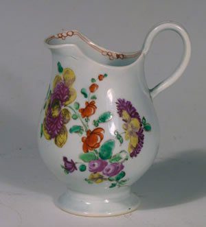 A Liverpool porcelain milk jug of a rare form with a very broad spout. It is painted in enamels with floral sprays and a red five circle border.