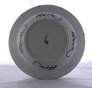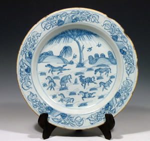 This Liverpool tinglazed earthenware is painted in blue on a pale blue glaze with Eight Horses of Mu Wang. This pattern is copied from Chinese porcelain. It is also found on Worcester porcelain. It has a double ring mark on the back.