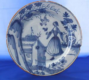 This tin glazed earthenware plate, probably Liverpool, decorated in blue on a pale blue glaze, has been designated as ‘The One Legged Milkmaid.’ It depicts an over size figure of a milkmaid at the side of a small “hen hut”.