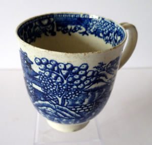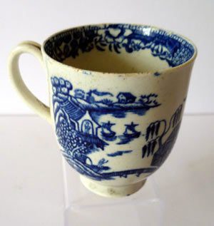 Liverpool blue & white printed coffee cup with an unusual pattern. it is of soft paste and the glaze has a rough feel and is blued. There is some pooling of the glaze and “thundercloud. The translucency is dirty greenish straw.