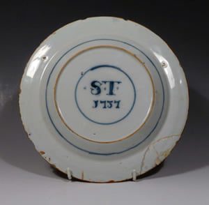 The reverse shows a ring mark with the footrim containing the letters ST above the date 1737 and another ring painted around the corvetto.
