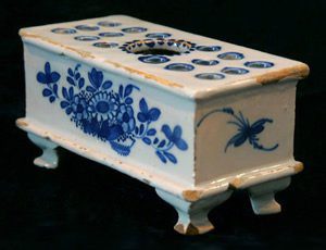 This rectangular Liverpool tinglaze ink stand on four feet is painted in blue on a bluish glaze with floral sprays on the long sides and insects on the short sides. The top is pierced by a large central hole with four smaller holes arranged around it and two banks of six holes to either side. The interior is divided into three compartments by two internal walls, with the middle one intended as an ink well. Another example of this form is inscribed “William, Done, Bricklayer Cheshire, 1761”