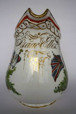 A bone china bodied jug, transfer printed with designs commemorating the alliance of England, Turkey and France during the Crimean war.