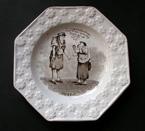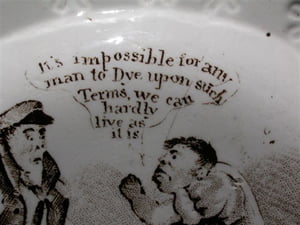 An interesting earthenware octagonal plate with a moulded daisy border. It makes a political point, playing on words! After the the Napoleonic Wars the economic conditions in Britain were harsh and the poorer people suffered badly. Textile workers, including dyers, were particularly hard hit and their wages were cut by up to a third