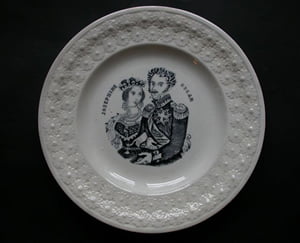 This plate was made by John Carr of Newcastle-on-Tyne and depicts King Oscar and Queen Josephine of Sweden who were married in 1823 and acceded to the throne in 1844.