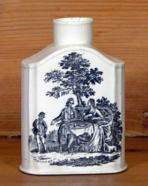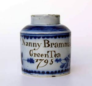 An earthenware tea canister made at Swinton. It is hand painted with blue flowers and is inscribed “Nanny Brammald Green Tea 1795”.