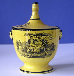 This canary yellow lidded sucrier has a transfer print in black of a version of the ‘Tea Party’ pattern which is identical to examples marked Sewell. To confirm this attribution the reverse has another Sewell pattern of a man fishing from a boat. The small handles are formed as satyr masks.