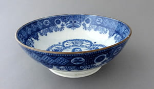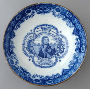 A commemorative pearlware bowl with pedestal, printed in underglaze blue. It was produced to celebrate the naval career of the revered Admiral Lord Nelson after his death at the Battle of Trafalgar in 1805. The same Chinoiserie border pattern was used on both the inside and outside of the bowl. The border consists of two large insects and a number of smaller insects in reserves surrounded by geometric and floral motifs. The rim of the bowl is enamelled in brown.