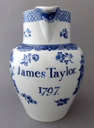 A rather fanciful Chinoiserie pattern printed in line-engraved underglaze blue on this pearlware presentation jug. The name James Taylor and the date 1797 are skillfully painted under the glaze. The pattern is enhanced with a variety of fruit and floral motifs. Two distinct borders are employed: A geometric and floral border is placed above the central pattern and a simple geometric border is printed both on the interior and exterior neck of the jug. The latter also decorates the handle. An undocumented pattern.