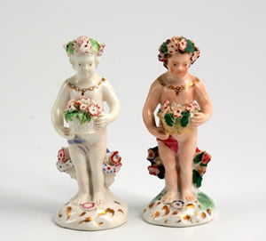 Two figures in Rockingham Porcelain. The left hand figure has simple decoration and a partial Red Griffin mark. The right hand figure is well coloured and is impressed “Rockingham Works Brameld” plus Cl 2 in red. It is also incised No 61. This is the first recording of a figure numbered 61. It partially fills a gap in the known series.