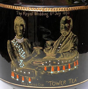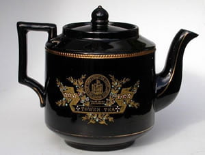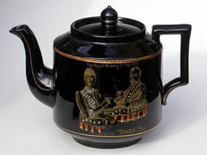 An earthenware teapot commemorating the marriage of Prince George, Duke of York, (later George V of the United Kingdom) to Princess May of Teck. It also advertises Tower Tea.