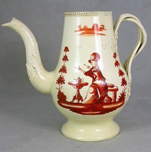 A creamware coffee pot attractively enamelled in red with a lady in a large hat taking tea. This type of decoration is often referred to as ‘Miss Pitt’, as a saltglaze teapot of this pattern is inscribed with that name. It is a touch of irony that ‘Miss Pitt’ is taking tea on such a splendid coffee pot!