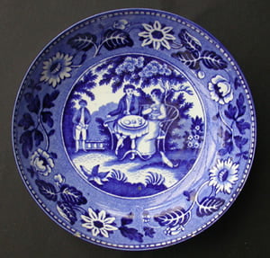 A blue and white earthenware saucer printed with a version of the popular ‘Tea Party’ pattern. It is interesting to compare this version both with the sophisticated Worcester version (PP6) and the cosier Sewell version (PP12)