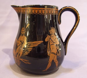 “In 1990 we found this Dudson “Jackfield” jug and through the black syrupy glaze on its bottom it was possible to make out the impressed word EBONY. Dudsons’ shiny black glazed ware is now referred to by this name”.