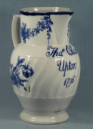 This small size ‘election shape’ jug is the only known dated and painted piece during the first year of Rose’s Coalport factory. It is painted underglaze blue and inscribed “Tho. Claro Upton 1796”.