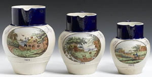 Set of three Chetham & Woolley feldspathic stoneware presentation jugs each with enamel decoration within an oval surround of a rural scene with the initials “J A” in puce script and the date 1801 in black.