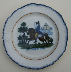 A pearlware plate, decorated in underglaze colours and depicting the Duke of York, mounted on his horse, in front of his encampment.